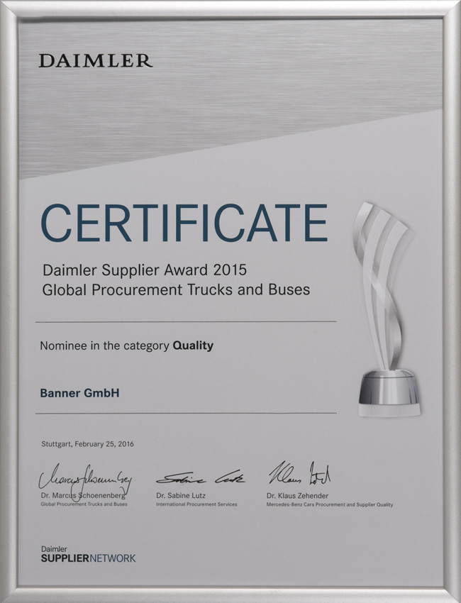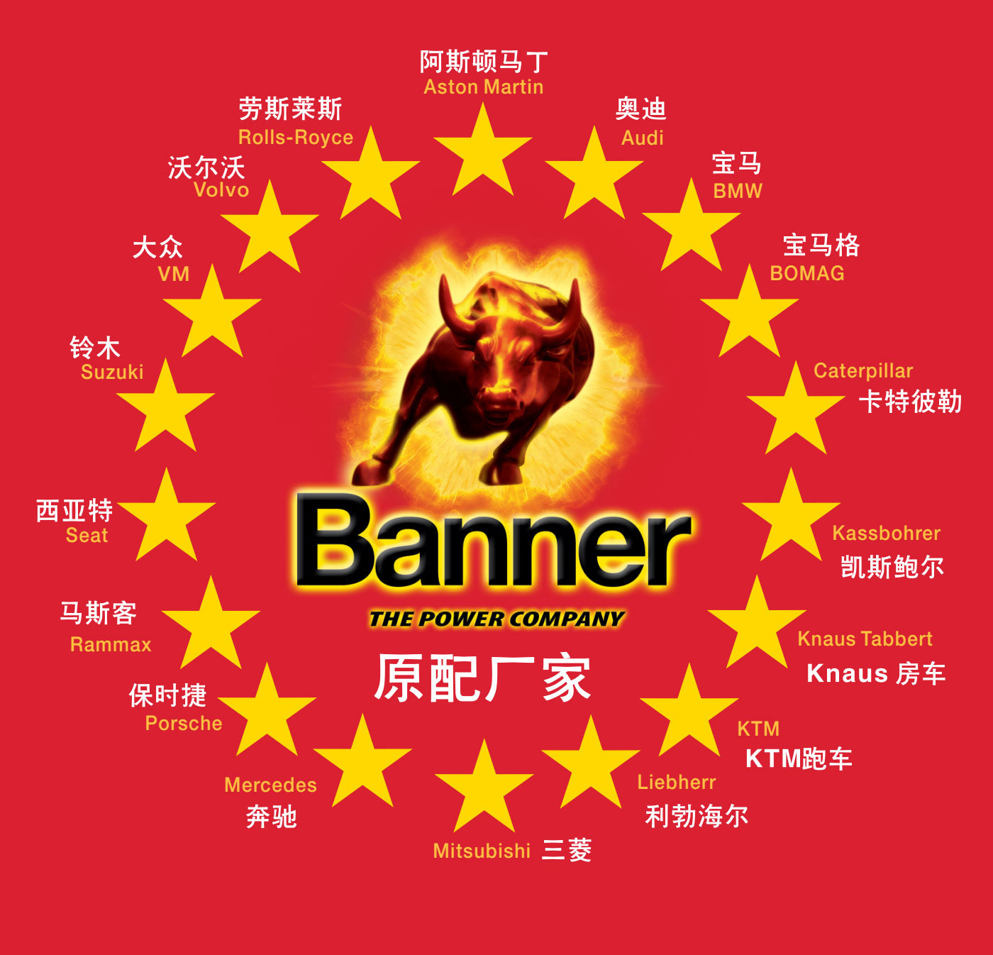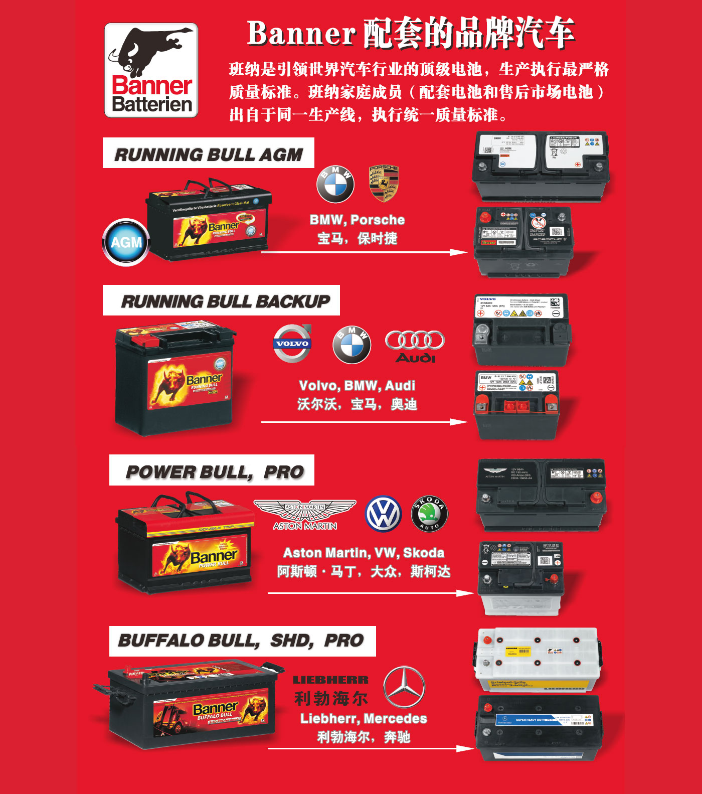 作为欧洲龙头的电池品牌,Banner制造和销售具备优秀品质的,适用于驱动系统和电力供应的启动电池和工业电池。在林茨-莱昂丁的生产工厂中,Banner拥有欧洲最现代化、最环保的电池工厂之一。Banner为宝马、劳斯莱斯、阿斯顿马丁、保时捷、奔驰、奥迪、大众、铃木、沃尔沃、西雅特、凯斯鲍尔、利勃海尔等汽车制造商提供配套。在过去的80年里,著名的大红牛标志代表了满足最严格的质量标准的电池生产,800名员工共同确保了品牌持久的成功。